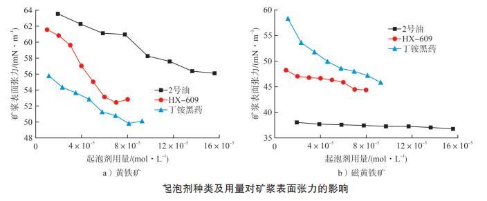 结果发现:随着起泡剂用量的增加,黄铁矿与磁黄铁矿的表面张力均整体呈下降趋势。对于黄铁矿矿浆表面张力的影响,2号油>HX-609>丁铵黑药,HX-609的表面张力虽然不是最低,但 HX-609达到最低矿浆表面张力所用药剂用量最少,可以明显降低药剂使用成本。对于磁黄铁矿矿浆表面张力的影响,丁铵黑药>HX-609>2号油,且三者差值较大,2号油用量为3×10⁻⁵ mol/L时可显著降低矿浆表面张力。