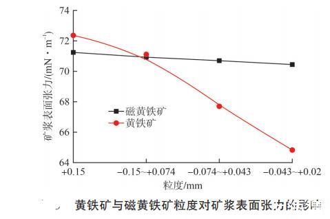 结果发现:粒度越细,矿浆表面张力越小。随着粒度从+0.15 mm降低至-0.043~+0.02 mm,黄铁矿矿浆表面张力下降较为明显,从 72.35 mN/m降低至 64.83 mN/m;磁黄铁矿矿浆表面张力下降幅度较小,矿浆表面张力从71.24 mN/m降低至70.46 mN/m。