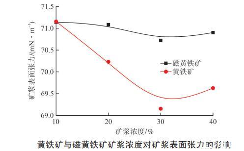 将粒度-0.074 mm的黄铁矿与磁黄铁矿配制成不同浓度的矿浆,考察矿浆浓度对矿浆表面张力的影响。