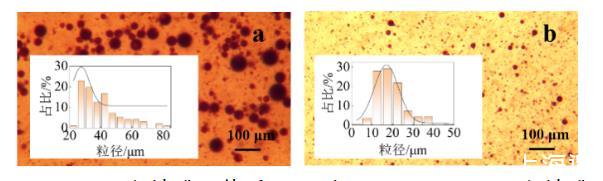 图6 C16A溶液(a)和C16A-SiO2乳化剂(b)形成的乳液光学图像和粒径分布