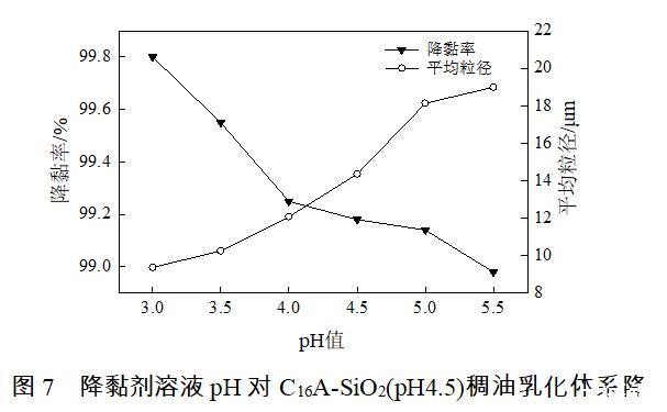 实验发现,pH≥6的水油混合液均质很难发生乳化作用,C16A-SiO2(pH4.5)降黏剂溶液与稠油发生乳化作用的溶液pH≤5.5。当溶液pH≤5.5时,降黏率达98.0%以上。随着降黏剂溶液pH的降低,稠油降黏率逐渐提升,C16A-SiO2(pH4.5)稠油乳化体系平均粒径减小,分布逐渐集中在5~20 μm之间。