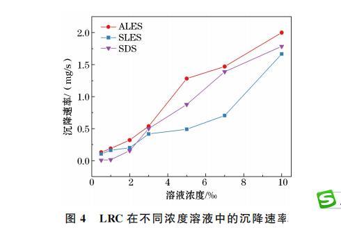 LRC在不同浓度溶液中的沉降时间和沉降速率曲线如图3和图4所示。由图3可知,当溶液浓度处于0.5‰至2‰之间时,煤尘在3种溶液中的沉降时间迅速缩短;当浓度大于2‰时,煤尘沉降时间差异不大。当CSDS≤1‰时,煤尘在SDS溶液中的沉降时间大于1 h,因此,SDS在此浓度范围内不能快速润湿LRC。当CALES和CSLES高于0.5‰时,煤尘沉降时间持续缓慢缩短,该浓度范围内ALES、SLES溶液润湿煤尘的时间小于500 s。由此可知,低浓度下ALES、SLES溶液比SDS溶液更容易润湿LRC。由图4可知,当溶液浓度大于3‰时,煤尘在SDS溶液中的沉降速度大于SLES溶液,拐点处于2‰至3‰之间。因此,当溶液浓度小于拐点浓度时,3种溶液润湿LRC的能力排序为ALES>SLES>SDS;当溶液浓度大于拐点浓度时,3种溶液润湿LRC的能力排序为ALES>SDS>SLES。上述分析表明,高、低浓度的ALES溶液对LRC均具有较强的润湿性。