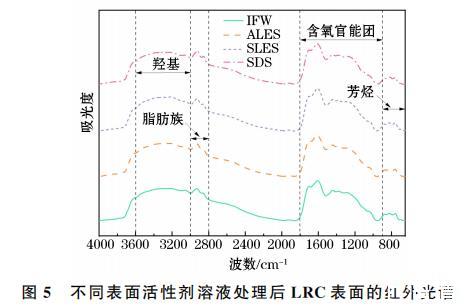 不同溶液处理后煤样的含氧官能团吸收带的峰面积和官能团占比见表1。由表1可知,经IFW、ALES、SLES和SDS溶液处理后煤样的C-O-C的峰面积分别为13.87、14.46、14.73和13.43。表明ALES、SLES在LRC表面均发生了明显吸附。由于SDS不含烷基醚基团,经SDS溶液处理后煤样的烷基醚基团所对应的峰面积并没有明显增加。由于NH4+(1385~1500 cm-1)的非对称变角振动与-CH3、-CH2的变形振动重合,因此将-CH3、-CH2的变形振动对应的峰面积进行加和分析。经不同溶液处理后煤样的NH+的非对称变角振动的峰面积占比分别由25.6%(IFW)增加至26.7%(ALES)、25.9%(SLES)和26.8%(SDS);-CH3和-CH2所占峰面积分别由69.55(IFW)增至75.38(ALES)、71.76(SLES)和72.02(SDS)。上述分析表明,ALES在LRC表面的吸附量要明显大于SLES和SDS在LRC表面的吸附量。