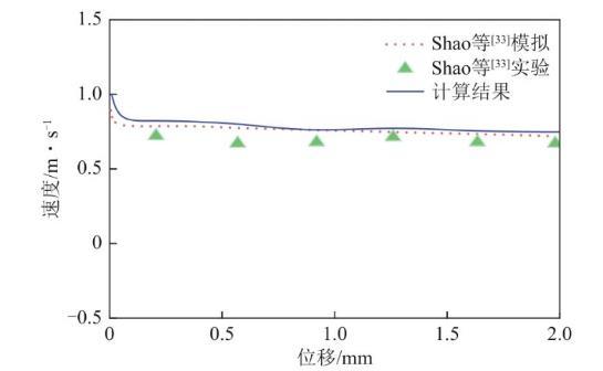 图4   颗粒速度-位移曲线的实验与模拟结果