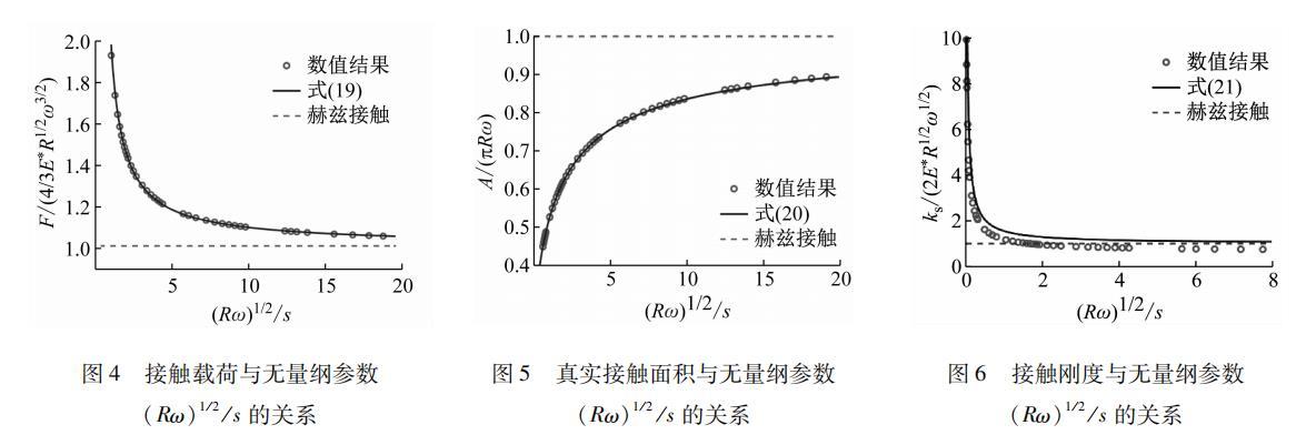 实际工程中不同粗糙表面对应的微凸体曲率半径各不相同,在上述的数值求解过程中,以微凸体曲率半径R=10 mm为例来研究表面张力对接触特性的影响,其他参数G=1 MPa, μ=0.4, β=0.1 J/m2。获得了无量纲接触载荷F/(4/3 E* R1/2 ω3/2)和无量纲接触面积A/πRω与无量纲参数(Rω)1/2/s的数值关系,通过对数值解的拟合,得到了考虑表面张力时载荷F和真实接触面积A与压入深度ω的关系式分别如式(19)和式(20)所示,且不同的R值只会影响式(19)和式(20)中的拟合系数。