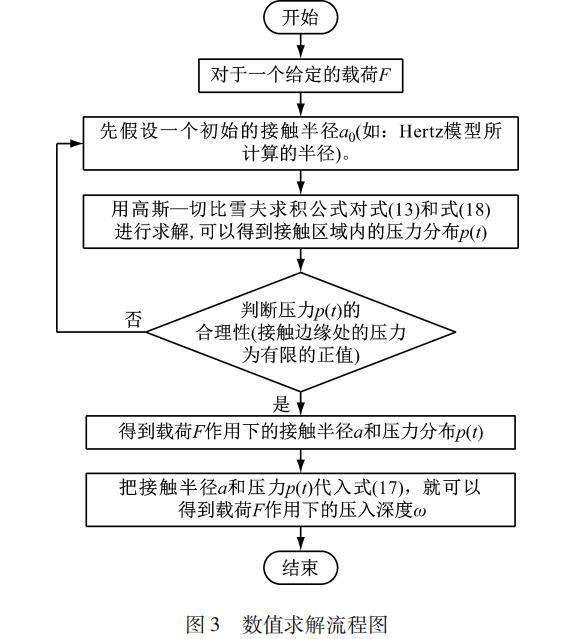 由于式(18)为奇异积分,难以获得它的解析解,故本文采用高斯-切比雪夫求积公式对单个微凸体模型进行数值求解,详细的求解步骤如下,图3给出了数值求解流程步骤为: