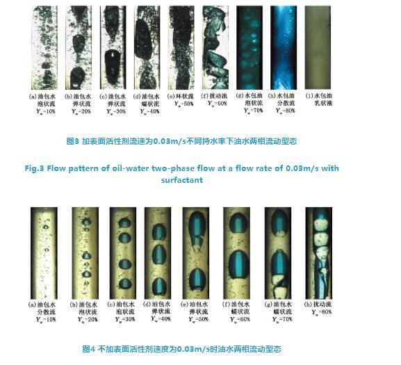 持水率增大到60%时,水相受油相径向阻力增大,由于加入表面活性剂水溶液与油相界面张力降低,水相无法继续保持环状流,在油相中形成扰动流。继续增大入口持水率至70%时,相反转发生,油为连续相的流动转变为以水为连续相的流动,出现水包油泡状流和水包油分散流。当入口持水率大于30%运行一段时间后,整个体系微蓝且透光性变差,说明形成了水包油型乳状液。而不加表面活性剂的情况下,主要以单一流态为主,环状流并未出现,且当持水率增大至80%时,仍然为油包水流动,相转换未发生,这与不加表活剂差别较大,说明加入表活剂后油水界面张力降低,使油水界面更易被拉长变形,且油水界面更易破碎,有利于油水相转换的发生。