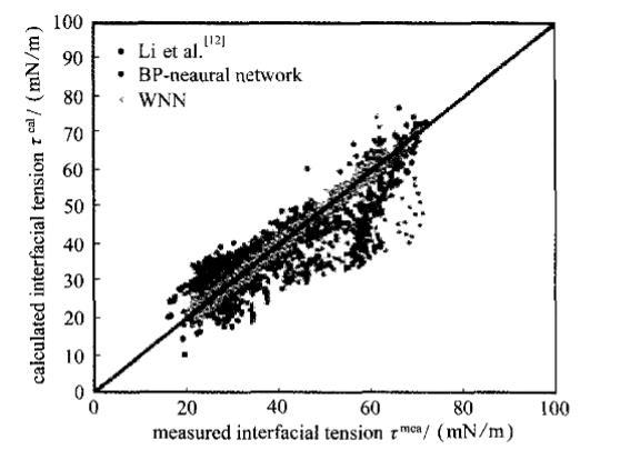 本研究创新性地构建了小波神经网络模型来进行界面张力预测。该模型本质上是将小波分析理论与传统的BP神经网络相结合。其核心优势在于,用具有良好局部时频特性的小波基函数(本研究采用Morlet小波)替代了传统S型函数作为隐含层的激活函数。小波基函数具有伸缩和平移的能力,能更有效地捕捉和逼近数据中不同频率的特征,从而在理论上赋予了网络更强的函数逼近能力和容错性能,有助于克服传统BP神经网络易陷入局部极小值、对初始权重敏感等固有缺陷。模型的构建与训练过程严谨:首先将全部数据随机划分为训练集和测试集;通过试算法优化网络结构,即系统性地改变隐含层神经元数量进行多次训练,最终确定了输入层6个节点、隐含层16个节点、输出层1个节点(即6-16-1)的网络架构为最优,该结构在保证精度的同时避免了过拟合。模型通过最速下降法与动量因子结合的方法进行迭代训练,不断调整层间连接权重及小波函数的伸缩平移参数,直至预测误差最小化。