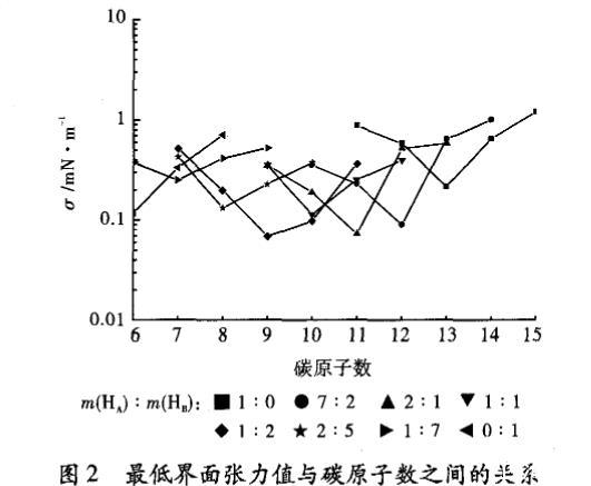 在测定直馏柴油与HA和HB的比值不同的表面活性剂体系间的界面张力时发现,HA与HB的比值为1:2时,油/水界面张力最低,因此可以判断出直馏柴油的EACN值为9。