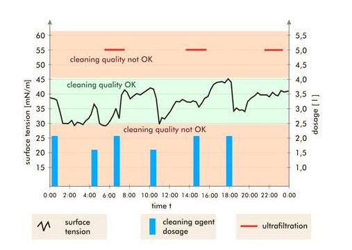 以上案例,通过连续对表面活性剂动态表面张力的监测,清晰可靠地得知清洗池的表活性剂浓度的情况,以此反映清洗池的清洗能力。可根据数据补充适量表面活性剂,保证稳定的清洗效果,从而达到清洗工艺的最优化。
