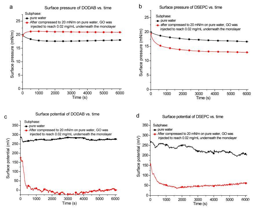 图 2. (a) DODAB 和 (b) DSEPC 单层的表面压力与经过时间的关系。 单层的表面电位与经过时间的关系 (c) DODAB 和 (d) DSEPC。 黑色曲线:单层在纯水亚相上被压缩到 20 mN/m 的表面压力。 红色曲线: 将单层压缩至 20 mN/m 后,将 600 μL 1 mg/mL GO 分散体小心缓慢注入单层下方 进入水亚相以达到 0.02 mg/mL 的 GO。