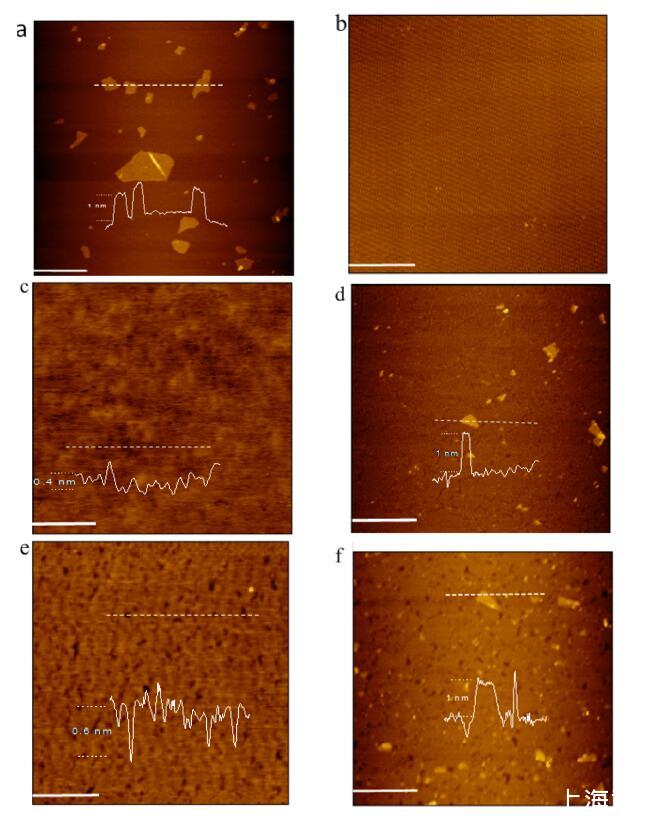 图 5. 新鲜切割的云母表面上的 AFM 图像(比例尺 = 1 μm):(a)干燥后的一滴 GO 分散体; (b) LB的对照实验 在空气-GO 水界面没有脂质沉积的薄膜; (c) 从空气-纯水界面转移的 DODAB LB 薄膜; (d) LB膜 从空气-GO水界面转移的DODAB; (e) 从空气-纯水界面转移的 DSEPC LB 薄膜; (f) LB膜 DSEPC 从空气-GO 水界面转移。 所有脂质 LB 膜都在 20 mN/m 的恒定表面压力下转移。