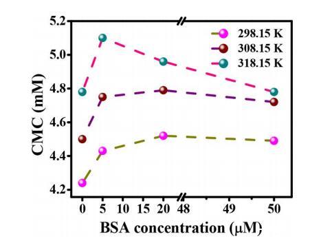 图1. 不同温度下[C10-4-C10im]Br2的CMC随BSA浓度的变化。