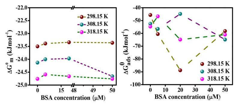 图3. 在不同温度下,DG0 m和DG0 ads随BSA浓度的变化。