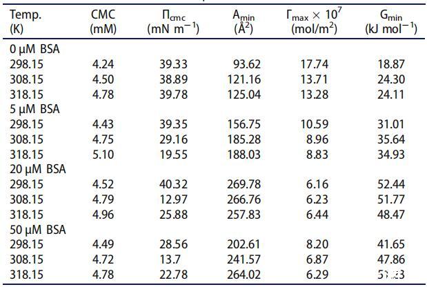 Gs min的值与形成的表面或表面活性的稳定性成反比。在所有实验温度下,所有系统获得的Gmin值都较低(表1)。Gmin的较低值表明将形成热力学上更稳定的表面。这表明稳定的表面形成和分子间的良好相互作用 [C10-4-C10im]Br2和BSA。[78]