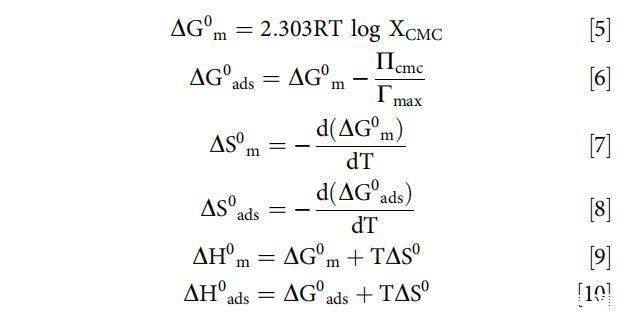 计算了在不同浓度和温度下[C10-4-C10im]Br2在不存在和存在BSA的情况下的胶束化和吸附热力学参数,以确定温度和BSA浓度的升高是否有利于胶束化(本体相浓度)或吸附 [C10-4-C10im]Br2的(界面浓度)。使用以下关系式计算各种热力学参数。[79]