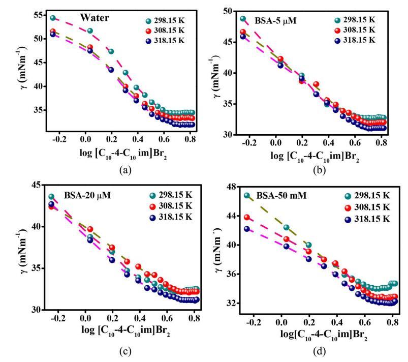图2. 在含有(a)0(b)5,(c)20和(d)50µM BSA的水溶液中,表面张力(γ)与log[C10-4-C10im]Br2的关系。