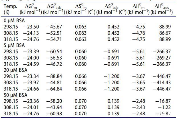 表2. [C10-4-C10im]Br2在不同温度下吸附和胶束化的热力学参数与BSA浓度的关系。