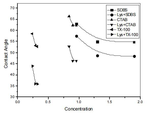 图2。在溶菌酶存在和不存在的情况下,不同种类表面活性剂的浓度与接触角曲线图