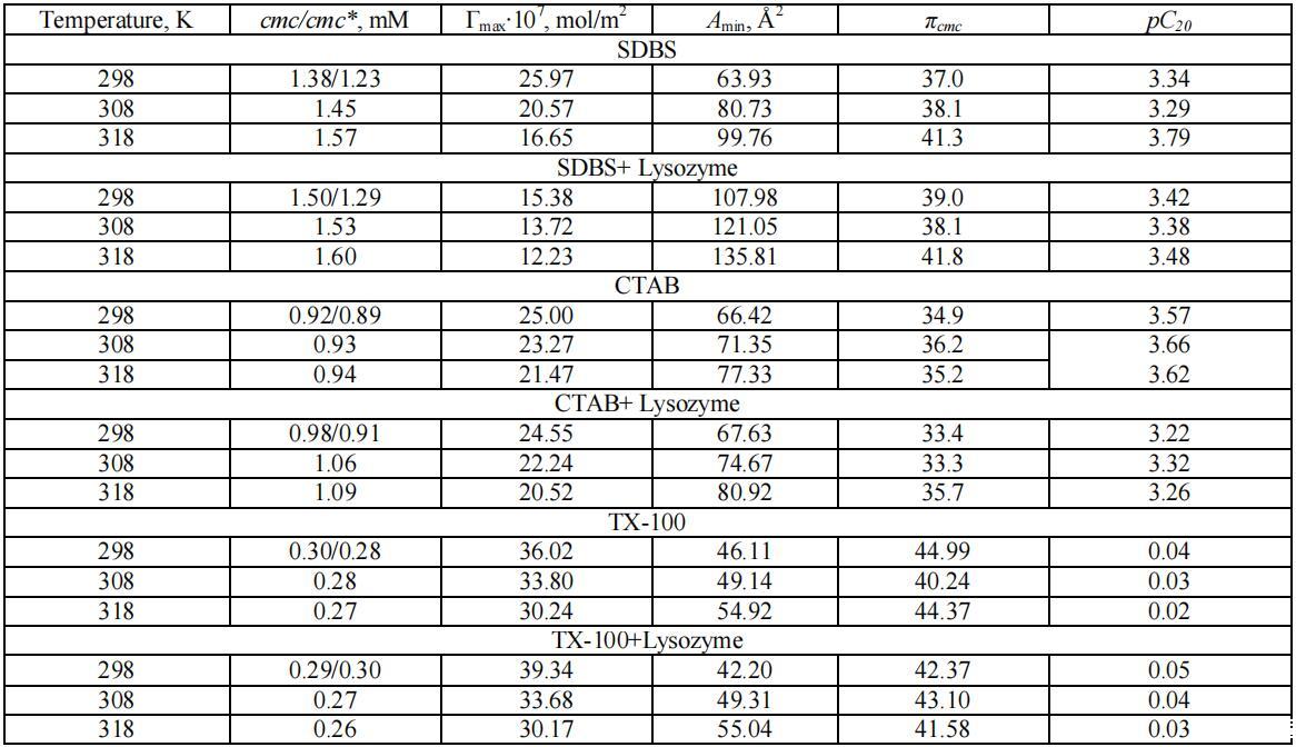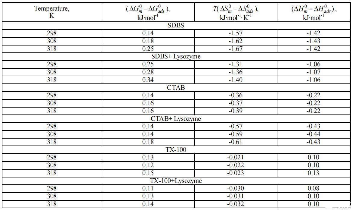 在溶菌酶存在和不存在的情况下,不同种类表面活性剂的物理化学和热力学性质如下所述: