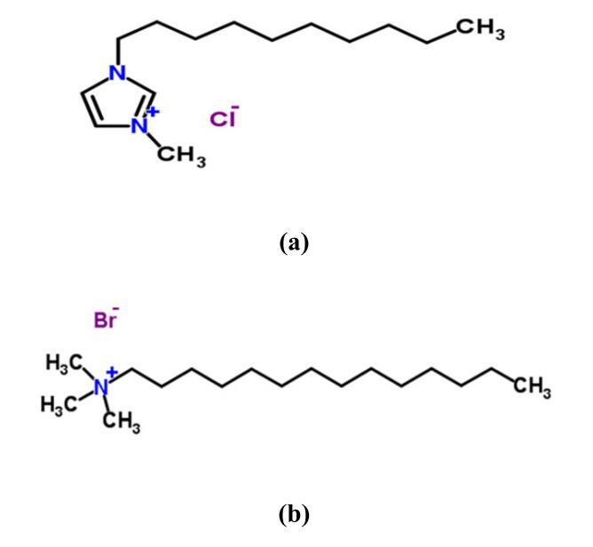 离子液体,特别是室温离子液体,由于其许多独特的性质,包括可忽略的蒸汽压,作为有毒溶剂、电化学的替代品和环境友好的替代品,以及在化学工业中用作反应介质,目前正受到极大的关注[1,2]。离子液体特别是表面活性离子液体(SAIL)在性质上是两亲性的,因为它们的分子中既有亲水部分,也有疏水部分,因此它们表现出良好的表面/界面活性和胶束形成。在许多研究中,传统的表面活性剂与离子液体混合,表面活性剂在这些离子液体中的聚集方式与在水中的聚集方式类似,但存在一些差异。第一个区别是,大多数纯离子液体的表面张力低于纯水的表面张力。第二个区别是,离子液体中表面活性剂的cmc大于纯水中的cmc,原因可能是与纯水中表面活性剂的疏水相互作用相比,离子液体中表面活性剂之间的疏水相互作用较低[3–6]。在一些研究中,水性离子液体被用作表面活性剂溶液的溶剂[7–13]。在大多数研究中,表面活性剂的cmc取决于离子液体的浓度。还观察到,在离子液体浓度较低时,cmc呈下降趋势,而在较高浓度时,cmc表现出增加的行为[8–9]。最近报道了1-烷基-3-甲基咪唑溴化离子液体对大型水蚤的毒性和抗氧化防御系统活性,主要归因于高浓度的离子液体[14]及其在斑马鱼氧化应激和DNA损伤中的作用[15]。同样,也对大鼠的亚慢性毒性进行了研究[16],但只有少数研究报告了毒性作用。