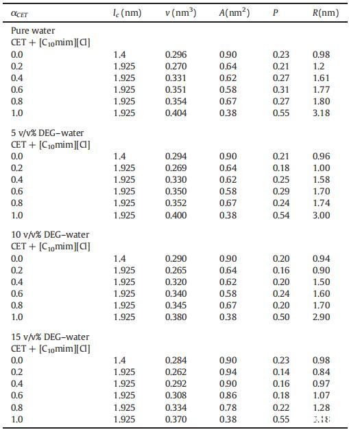 表5在纯水中以及在T=298.15 K下存在不同体积百分比的DEG+水二元混合物时,纯CET、[C10min][Cl]和混合物CET+[C10min][Cl]的有效疏水链长度(lc)、疏水链体积(v)、极性头基团表面积(A)、填充参数(P)和半径(R)的值。