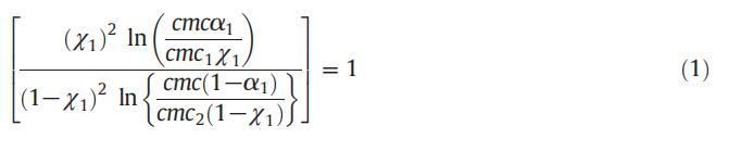 使用鲁宾模型获得的胶束摩尔分数(X1)用于计算混合胶束中[C10min][Cl]的CET活度系数ƒ1和ƒ2。(5)及(六):