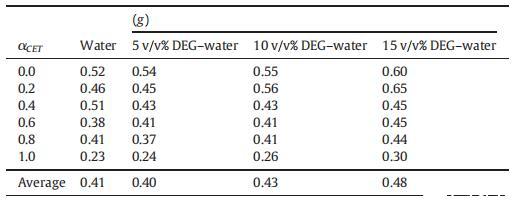 表4纯CET、[C10min][Cl]和CET+[C10min][Cl]混合物的表面过剩(Γmax)、每分子最小面积(Amin)、吸附效率(pC20)和吸附自由能(ΔGad 0),作为纯水中CET摩尔分数α的函数,并且在T=298.15K时存在不同体积百分比的二元DEG-水混合物。