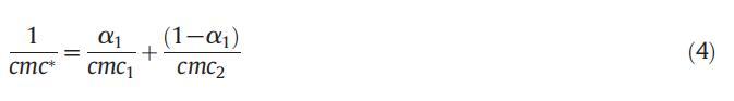 式中,cmc1、cmc2和cmc分别表示CET、[C10min][Cl]及其混合体系的实验cmc值,χ1表示表面活性剂的胶束摩尔分数(CET),α1表示组分1的体积摩尔分数。