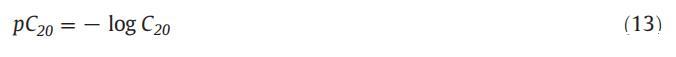 为了计算吸附效率,重要的是要知道产生最大吸附量的两亲分子的摩尔浓度。最大吸附量出现在表面张力降低到20mn·m时−1[64]和C20是该点的摩尔浓度。用pC20表示的两亲分子的吸附效率如下所示: