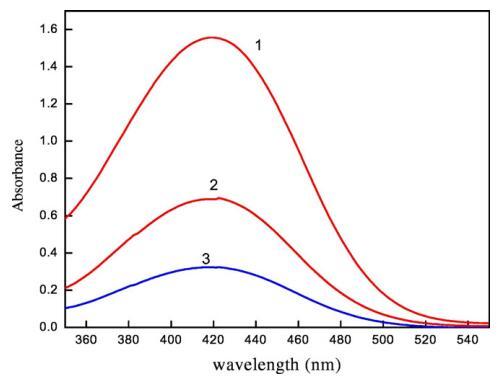图7.含有不同体积百分比二甘醇-水混合物(1)5 v/v%二甘醇-水(2)10 v/v%二甘醇-水和(3)15 v/v%二甘醇-水的CET/[C10min][Cl]胶束聚集体中含水铬吸收光谱的变化。