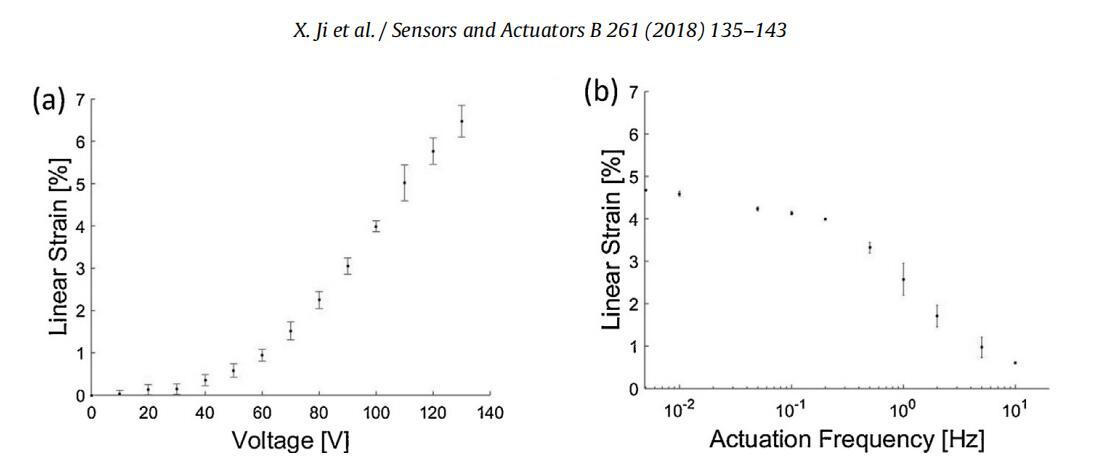 图8。由1.4μm厚PDMS膜和单层电极组成的DEA的表征。(a)应变与电压曲线,显示100V时约4%的线性应变。(b)应变与驱动频率曲线。