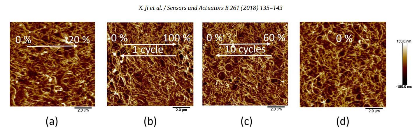 图5。MWCNT/P3DT单层电极的AFM图像。(a)在20%单轴应变下。(b)在100%单轴应变后恢复到0%应变。(c)在10个周期后,以60%单轴应变恢复到0%应变。(d)在0%单轴应变下,不施加任何应变。箭头指示拉伸方向。