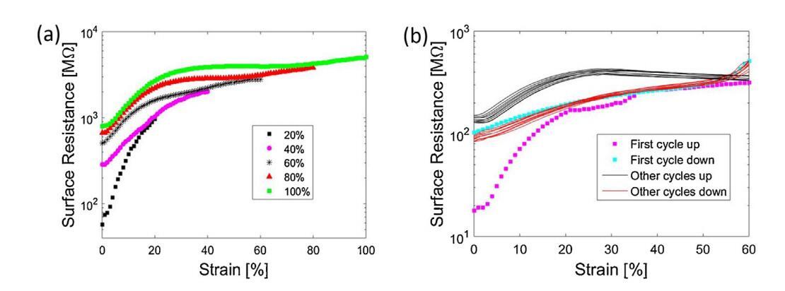 图6a显示了在20%和100%之间增加最大应变的不同连续循环中,样品表面电阻的变化。仅显示拉伸循环。在前20%应变期间,电阻增加约一个数量级,表明MWCNT网络内的互连比降低。当恢复到0%应变时,电阻没有达到其初始值,而是增加了6倍。这突出了由于机械变形导致的电性能的不可逆变化。随着最大施加应变的增加,每个循环都会发生这种情况。然而,可以观察到,在恢复到0%应变后,表面电阻的增加在60%应变以上不太明显。值得注意的是,单层电极在100%单轴应变下仍保持导电。