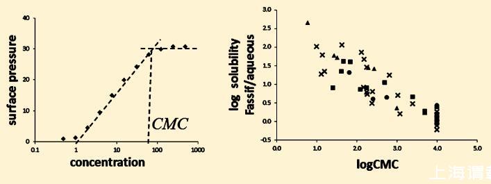 表面张力由一种成熟的体外测定法测定,该测定法通过测量化合物的临界胶束浓度和两亲性来评估化合物的表面活性剂性质。 两亲性是用于量化化合物与生物膜亲和力的一个关键属性,在制药工业中广泛用于预测药物诱导的磷脂病,11,12 − 脑屏障渗透,13和药物淋巴吸收。 14在这项工作中,XVDEVIOS官方下载免费版同样评估了化合物对生物相关介质中所含胶束的亲和力是否可以用化合物固有的表面活性剂性质来解释。 因此,XVDEVIOS官方下载免费版对不同化合物的表面活性剂性质进行了表征,以将此类表面活性性质与FaSSIF中观察到的与水介质溶解度相比的溶解度增强程度相关联。 共分析了51个分子,包括上市药物和罗氏专利化合物,具有广泛的溶解性、亲脂性和电离状态。