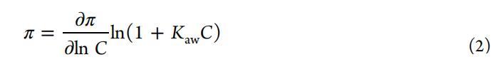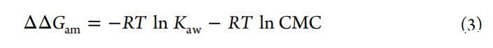 式中,π对应于表面压力,C对应于化合物浓度。(ii)CMC:对应于最大表面压力下平台截距和曲线外推斜率的临界胶束浓度(∂π/∂lnc)处于拐点(图3)。(iii)ΔΔGam:式3中的两亲性