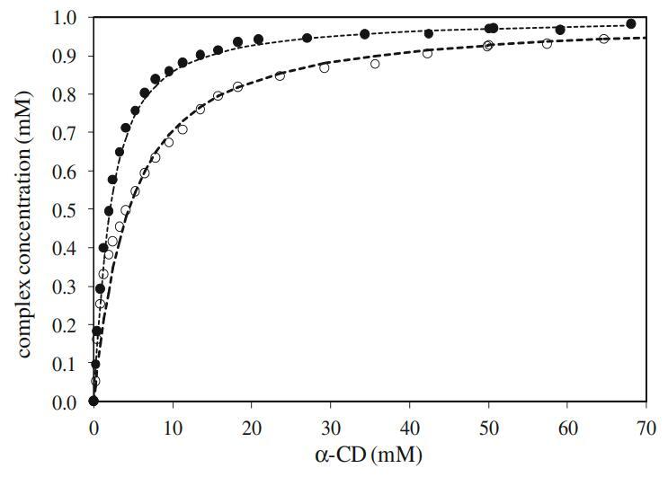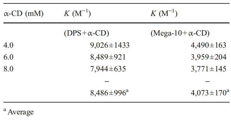 表1不同α-CD浓度下α-CD与DPS和Mega-10的1:1包合物的缔合常数(Ka)值