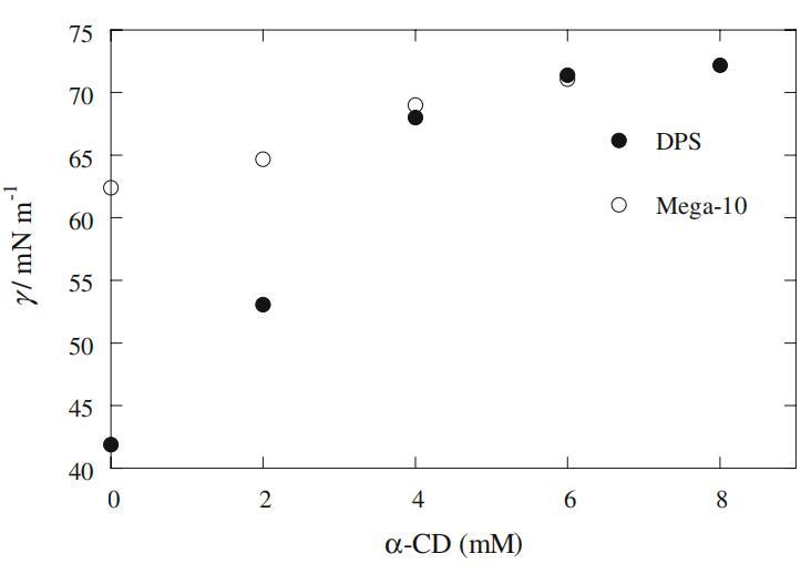 图1恒定2 mM浓度下Mega-10和DPS的界面张力(γ)变化与α-CD浓度的关系图