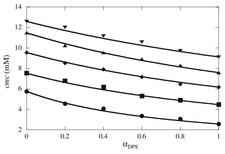图8 Mega-10+DPS混合系统的混合临界胶束浓度(cmc)与αDPS的曲线图。填充圆、正方形、菱形、三角形和反向三角形分别表示存在0(填充圆)、2(填充正方形)、4(填充菱形)、6(填充三角形)和8(填充反向三角形)mMα-CD时的实验cmc。实线表示理想的cmc