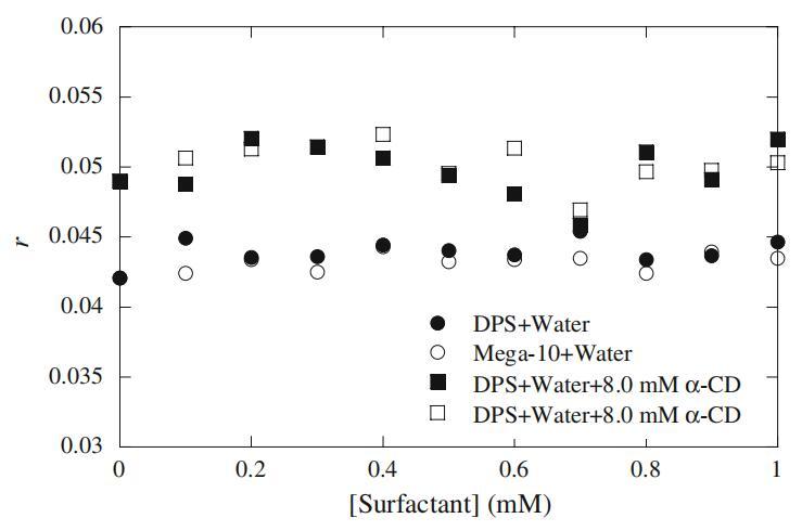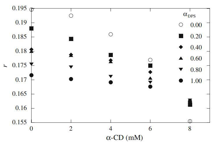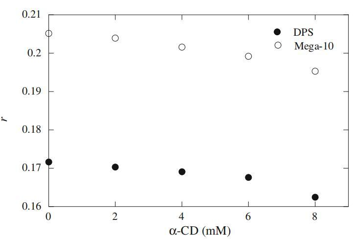 图12恒定表面活性剂浓度(Mega-10,20 mM和DPS,15 mM)下荧光各向异性r与α-CD浓度的关系图