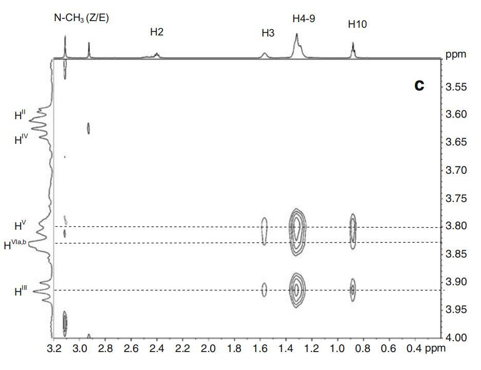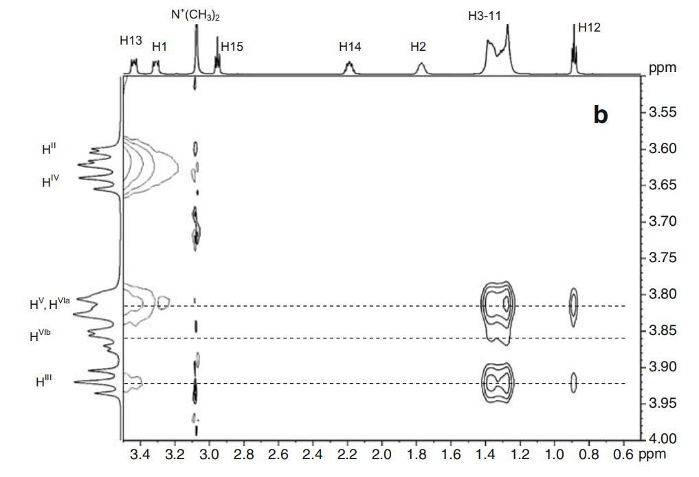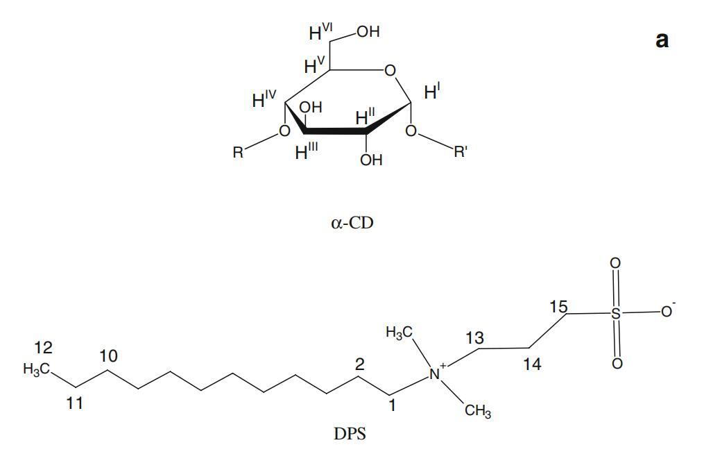 图7α-CD(所示为一个吡喃葡萄糖苷单元)、DPS和Mega-10的示意图。表面活性剂和α-CD的2D-ROESY光谱的关注区域。阿拉伯数字表示表面活性剂原子,而罗马数字表示CD原子。b为DPS-α-CD系统。Mega-10-α-CD系统的c