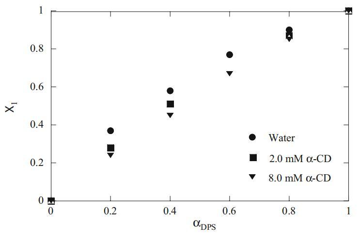 图9 Mega-10+DPS混合体系在水中和不同α-CD浓度下的胶束(X1)与α-DPS的曲线图