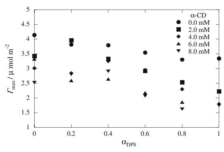 式中,γ、C、R、T和P为界面张力、表面活性剂浓度、理想气体常数、温度和压力。纯系统和混合系统的Γmax值如图4所示。纯Mega-10和DPS分子的Γmax值与文献报道的值一致[26,28]。图4显示Mega-10的Γmax值略高于DPS。这一结果表明,与DPS相比,Mega-10分子在空气-水界面以更紧凑的形式排列。两种表面活性剂的Γmax值随着α-CD量的增加而减小,表明表面活性剂物种从界面上的解吸(图4)。这种行为是表面活性剂与α-CD之间存在相互作用的另一个证据。对于Mega-10和DPS在不同DPS摩尔分数(αDPS)下的二元混合物,Γmax值随着DPS量的增加而减小,表明DPS在界面上吸附后形成混合单层。