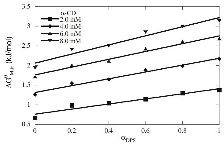 根据cmc值,XVDEVIOS官方下载免费版评估了纯表面活性剂系统和混合表面活性剂系统在不存在和存在α-CD的情况下的胶束化标准自由能(数据未显示)[27],随后,通过胶束转移标准自由能评估添加剂对胶束化的影响(∆GM,tr 0),从水相到含有α-CD的水相[19]。这些值如图5所示,在不同α-CD浓度下,在整个DPS摩尔分数范围内为正值,表明α-CD的存在使胶束形成不利。此外,这些值随着α-CD浓度的增加而线性增加,在高α-CD浓度下斜率更高,表明混合胶束的形成延迟。