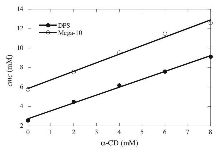 图3 Mega-10和DPS cmc依赖于α-CD浓度的曲线图