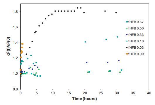 对于0.03<fHFBII<0.2的泡沫中气泡尺寸的增加,观察到在初始粗化数小时后,曲线趋于平稳。在粗化过程中,小气泡的收缩和总气泡中较大气泡的增长导致泡沫总表面积的净减少。上述结果表明,气泡稳定性随着表面积的逐渐减小而增加,这与朗缪尔槽上吸附系统在大变形压缩/膨胀循环中观察到的行为一致。