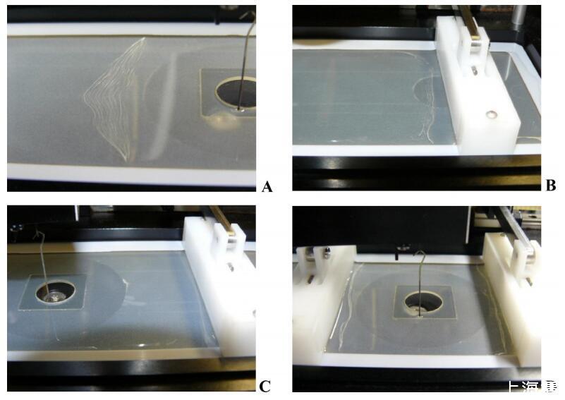 图5。在液体中不同疏水组分的朗缪尔槽上,HFBII/WPI混合溶液的吸附层照片:a:fHFBII=1,B:fHFBII=0.67,C:fHFBII=0.5,D:fHFBII=0.33。