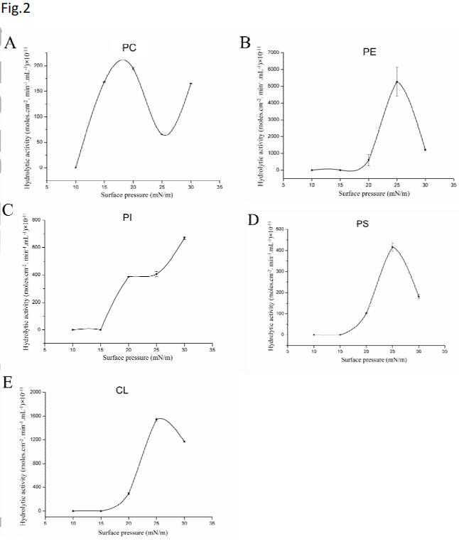 图2示出了使用各种磷脂作为水解底物获得的详细活性-表面压力曲线。可以看出,酶的水解活性高度依赖于表面压力。然而,每种底物的活性曲线不同。发现基板PE、PS和CL的钟形曲线具有特征性的最佳表面压力值(图2B、D、E)。在低于15 mN/m的表面压力下,未检测到基本酶活性。水解活性随表面压力的增加而增加。在25 mN/m的表面压力下,观察到PE、PS和CL的最大活性。然而,当表面压力高于25 mN/m时,所有这些磷脂的水解活性降低。与所有测试的底物相比,在25 mN/m的表面压力下,PE的水解率最高,水解活性达到5272.31×10-11摩尔。cm-2。最小-1。mL-1。对于PI,在15 mN/m以下也没有观察到水解速率,但是,没有观察到钟形曲线,并且随着表面压力从15 mN/m增加到30 mN/m,活性增强(图2C)。对于PC,从10 mN/m到25 mN/m观察到钟形曲线,但在30 mN/m的表面压力下,活性进一步增加。随着表面压力从25 mN/m增加到30 mN/m,表面轮廓上的单层构象可能发生了变化,导致活性增加。在本实验中,在测试的表面压力范围内,SM没有活性。从π-A曲线可以看出,在25 mN/m的表面压力下测试的所有磷脂都处于液态冷凝状态,没有达到各自的坍塌压力。在这种情况下,超卵磷脂酶对不同单分子磷脂膜的偏好顺序为PE>CL>PS>PI>PC。在这些条件下,SM没有活性。Lecitase Ultra选择性的详细机制仍需阐明。