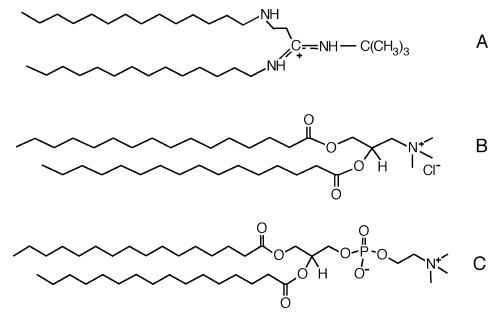 图1.(A)双14酰胺的分子结构;(B)DPTAP;和(C)DPPC。