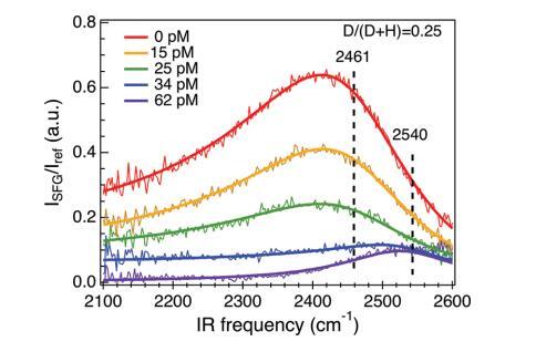 图5。HOD在H2O中OD拉伸频率窗口的光谱,给出了在diC14氨基单层下含有增加浓度DNA的磷酸盐缓冲亚相。HOD的OD拉伸光谱只有一个单峰结构,并且清楚地表明,随着DNA浓度的增加,共振振幅降低,共振向更高的频率移动。